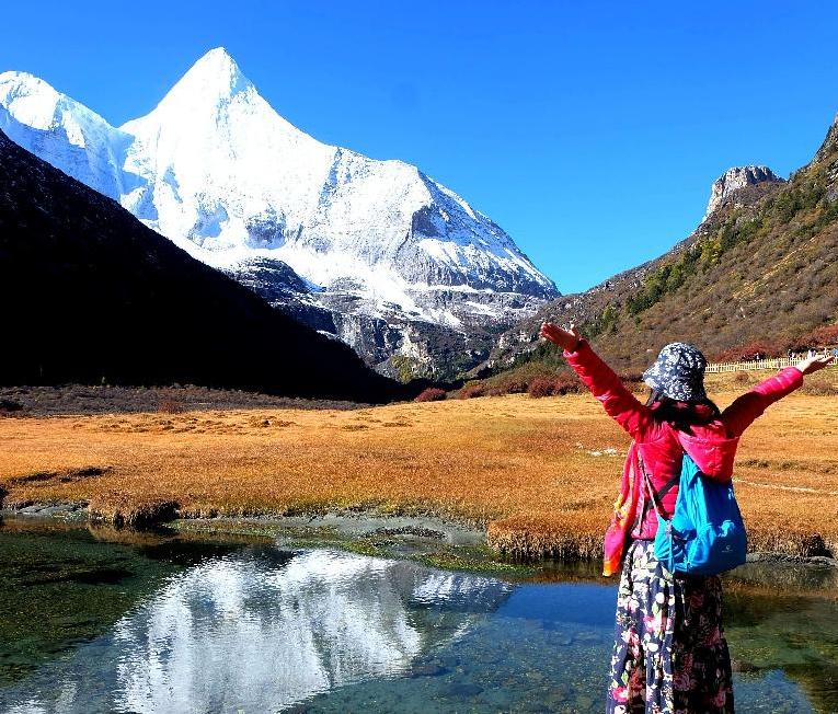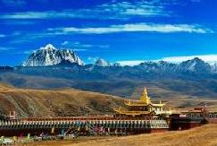朝食後、バスで亜丁へ。亜丁の入口で乗馬か歩きで冲古寺へ観光、壮美の山--仙乃日の風光を観光後,洛牧場へ、牧場の前は央万勇山及び夏洛多吉山だ。