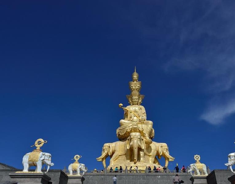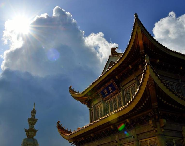 Step 2: 09:30-11:30 Sightseeing on the mountain top --- Golden Submit, visit Golden temple, the silver temple , the huge Puxian Statue, enjoy the magnificent view of the clouds, mountains, forest.