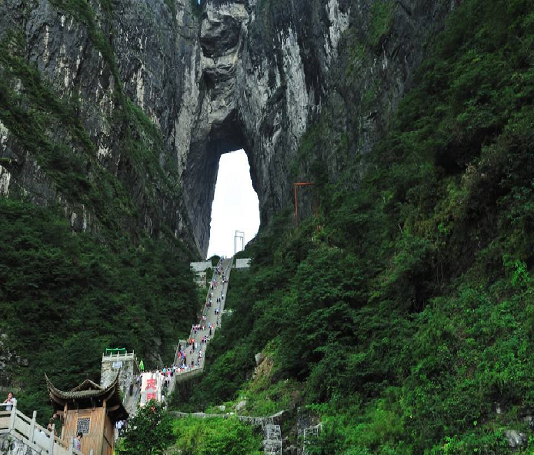 Breakfast in the hotel drive to Tianmen Mountain National Park(天门山) (also known as Heaven Gate Mountain) by the longest cable car in the world (7455 meters) and marvel at the stunning 99 hairpin road against the high cliffs. You'll reach the base platform and a long flight of stairs leading up towards the Tianmen Cave – a natural water-eroded cave with the highest elevation in the world! This is known as the 'Heaven Reaching Ladder'. At the western side of the summit, there you can find the newly built Tianmen Temple. Sightseeing for 4 -5hours.