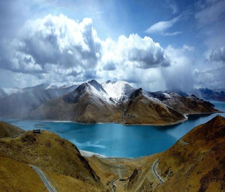 - Yamdrok-tso: A sacred lake with stunning blue water on a almost desert mountain background.