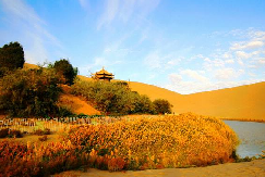 Echoing-Sand Mountain or “Mingsha Mountain” is one of the Four Great Singing Sands of China. Completely piled by sands, the mountain stretches for 40km in length and 20km in width respectively, with the highest point reaching 250m. When there is wild wind, the sands will be blown up and make loud sound, while the sound sounds like being produced by some ancient musical instrument when blew by breeze, hence the name. Surrounded by the Mingsha Mountain, Crescent Lake, is named after its crescent-like shape. According to historical record, the lake has been in existence for hundreds of years without ever being buried by the sand; it is really a geological wonder.