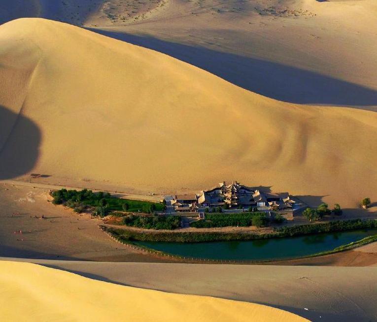 Echoing-Sand Mountain and Crescent Lake: Located 5 km (about three miles) south of Dunhuang City, the Echoing-Sand Mountain, for many Chinese well known as Mingsha Mountain, is celebrated for the sound of the moving sand. In 1994 it was acclaimed as the national key scenic spot. Together with the Crescent Springand the Mogao Caves, the Echoing-Sand Mountain is most popular sitein Dunhuang travel.You may wonder why the sand makes these different sounds. There is a legend that says how, in ancient times, a general with many soldiers came here to fight in a war with their enemies.