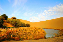 Echoing-Sand Mountain or “Mingsha Mountain” is one of the Four Great Singing Sands of China. Completely piled by sands, the mountain stretches for 40km in length and 20km in width respectively, with the highest point reaching 250m. When there is wild wind, the sands will be blown up and make loud sound, while the sound sounds like being produced by some ancient musical instrument when blew by breeze, hence the name. Surrounded by the Mingsha Mountain, Crescent Lake, is named after its crescent-like shape. According to historical record, the lake has been in existence for hundreds of years without ever being buried by the sand; it is really a geological wonder.